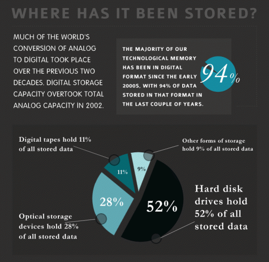 По диаграмме видно, что больше всего информации хранится на жёстких дисках (52%), следом идут оптические носители (28%) и замыкают тройку различные цифровые ленты (11%).