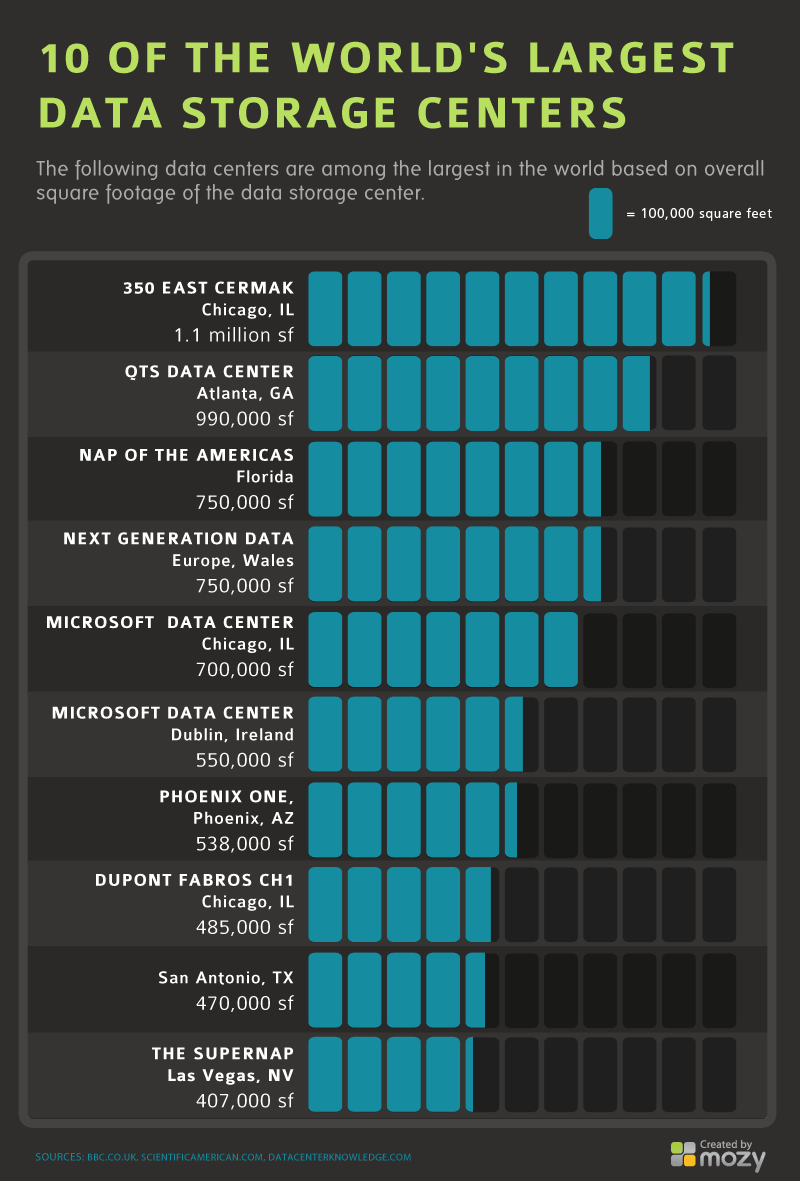 Ниже представлены 10 крупнейших мировых дата-центров. Самый большой расположен в Чикаго, США, его площадь более ста тысяч квадратных метров.