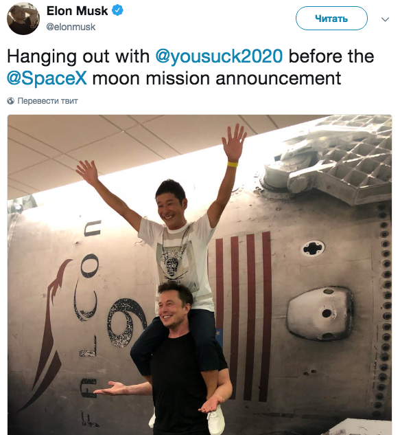 Илон Маск дар “твиттери” худ суратеро бо миллиардери ҷопонӣ Юсаку Маэдзава интишор намуд. Ин шахс нақша дорад соли 2023 аввалин сайёҳ яъне туристи кайҳони шавад, ки ба мадори Моҳ бо ракетаи Big Falcon Rocket сафар мекунад.