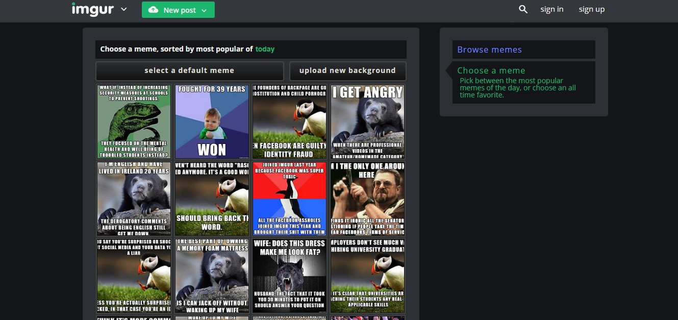 Создавать мемы можно на специальной странице imgur — одного из крупнейших хостингов для вирусных изображений. Генератор показывает самые популярные картинки сервиса за последний день, месяц, год и всё время существования imgur, чтобы вы могли выбрать любое из них в качестве фона. Изображения можно также искать через встроенный поиск. После выбора картинки остаётся добавить текст, настроить его размер и сохранить результат.