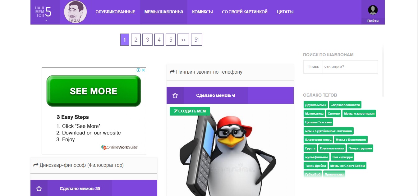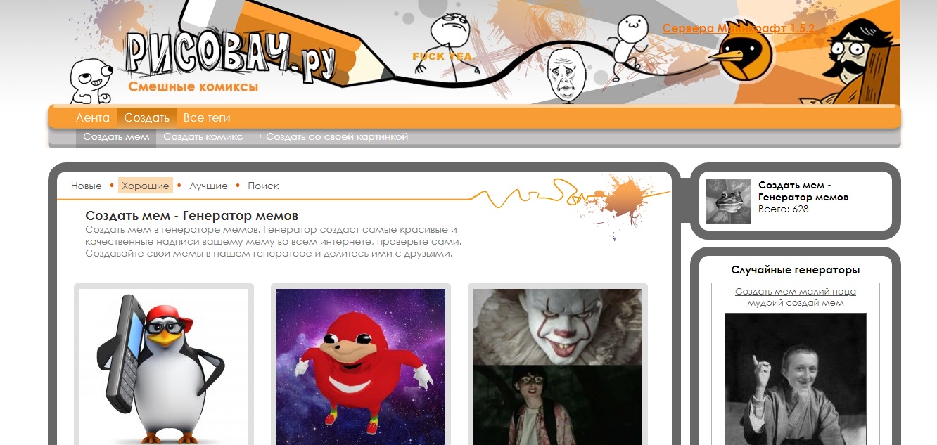 Mr-Mem — ещё один генератор, предназначенный для русскоязычной аудитории. Этот сервис тоже предлагает фоновые заготовки для обычных мемов и комиксов. Но вы можете не просто добавлять текст, а настраивать его цвет и шрифт, а также прикреплять стикеры. К тому же, в отличие от «Рисовача», на сайте Mr-Mem есть список тегов, упрощающий поиск по фонам, а редактор не оставляет водяных знаков на мемах.
