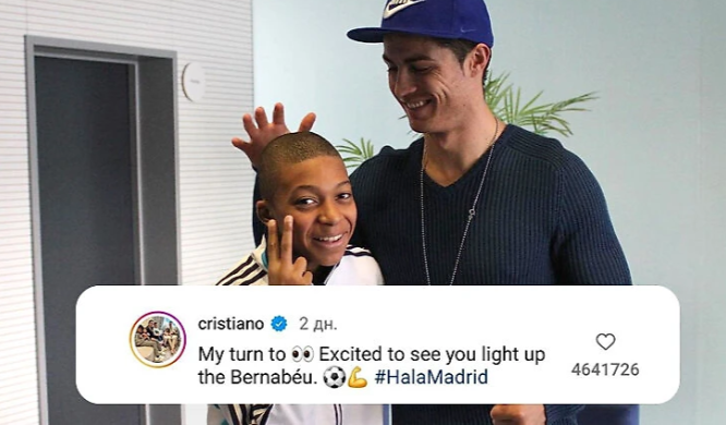 «Не могу дождаться, когда увижу, как ты зажжешь на «Бернабеу», – написал Криштиану Роналду под постом Килиана Мбаппе о переходе в «Реал».