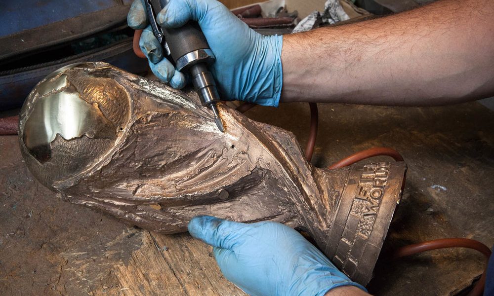 Создание кубка начинается с удаления излишков металла на специальном оборудовании. Затем он шлифуется, и с помощью молотка и стамеска, скульптор дополняет мелкие детали. Трофей тщательно полируется и помещается в специальную ванну, где он очищается под действием ультразвука, сообщает ca-news.org.