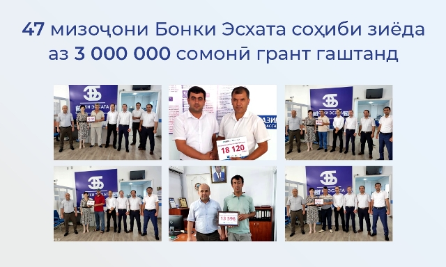 «Ин дафъа мизоҷони филиалҳои Ҳисор, Бохтар, Ёвон, Мастчоҳ, Турсунзода, Истаравшан, Панҷакент ва Идораи амалиётии шаҳри Хуҷанд ба маблағи 309 074,66 доллари ИМА ё 3 171106 сомонӣ грант гирифтанд», — таъкид намуданд дар бонк.
