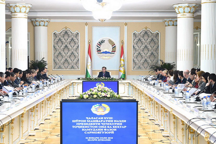 Имрӯз таҳти раёсати Асосгузори сулҳу ваҳдати миллӣ — Пешвои миллат, Президенти Ҷумҳурии Тоҷикистон, Раиси Шӯрои машваратӣ оид ба беҳтар намудани фазои сармоягузорӣ муҳтарам Эмомалӣ Раҳмон ҷаласаи XVIII Шӯро баргузор гардид. Пешвои миллат муҳтарам Эмомалӣ Раҳмон ҷаласаро оғоз намуда, нахуст Котиби масъули Шӯро, Раиси Кумитаи давлатии сармоягузорӣ ва идораи амволи давлатии Ҷумҳурии Тоҷикистон Фаррух Ҳамрализода, Роҳбари Намояндагии Бонки аврупоии таҷдид ва рушд дар Ҷумҳурии Тоҷикистон хонум Айтен Рустамова, Роҳбари Котиботи Шӯрои машваратии назди Президенти Ҷумҳурии Тоҷикистон оид ба беҳтар намудани фазои сармоягузорӣ Шараф Шерализода ва аъзои нави Шӯрои машваратиро ба ҳозирин муаррифӣ намуданд. Сипас, оид ба масъалаи якуми рӯзномаи ҷаласа, рафти иҷрои қарорҳои Шӯрои машваратӣ гузориши Котиби масъули Шӯро, Раиси Кумитаи давлатии сармоягузорӣ ва идораи амволи давлатии Ҷумҳурии Тоҷикистон Фаррух Ҳамрализода шунида шуд. Дар ин робита оид ба тасдиқи Методологияи нави тарифӣ аз ҷониби Ҳукумати Ҷумҳурии Тоҷикистон аз 26 майи соли 2017 ва аз моҳи октябри соли сипаришуда мавриди амал қарор гирифтани он, устуворшавии мавқеи Ҷумҳурии Тоҷикистон барои соли 2018 дар ҳисоботи “Пешбурди соҳибкорӣ”-и Бонки ҷаҳонӣ, соли 2017 то ба 52%коҳиш ёфтани шумораи санҷишҳои фаъолияти субъектҳои хоҷагидор нисбат ба соли 2016, моҳи августи соли 2017 дар сатҳи «B3 – рушди устувор» муқаррар шудани рейтинги кредитии соҳибихтёрии Тоҷикистон аз ҷониби Агентии рейтингии байналмилалии Moody’s Investors Service ва Агентии Standard and Poors иттилоъ дода шуд. Масъалаи дуюми рӯзномаи ҷаласа ба таҳлили беҳтар намудани фазои сармоягузорӣ дар бахшҳои нақлиёт ва логистика ва лоиҳаи Нақшаи чорабиниҳо дар ин самт бахшида шуда, вобаста ба натиҷаҳои он гузориши Вазири нақлиёти Ҷумҳурии Тоҷикистон Худоёрзода Худоёр шунида шуд. Вобаста ба масъалаи сеюми рӯзномаи ҷаласа, Раиси вилояти Суғд Раҷаббой Аҳмадзода, дар бораи фаъолияти Шӯрои минтақавӣ оид ба беҳтар намудани фазои сармоягузорӣ дар назди Раиси вилояти Суғд гузориш дод. Тибқи банди чоруми рӯзномаи ҷаласа натиҷаҳои таҳлил ва лоиҳаи Нақшаи чорабиниҳо оид ба беҳтар намудани фазои сармоягузориву соҳибкорӣ дар бахши бонкдорӣ ва молияро Раиси Бонки миллии Тоҷикистон Ҷамшед Нурмаҳмадзода муаррифӣ намуд. Оид ба масъалаи ниҳоии рӯзномаи ҷаласа, Котиби масъули Шӯро, Раиси Кумитаи давлатии сармоягузорӣ ва идораи амволи давлатии Ҷумҳурии Тоҷикистон, Фаррух Ҳамрализода баромад карда, масъалаи беҳтар намудани фазои сармоягузориву соҳибкорӣ дар бахши маориф ва илм, инчунин муаррифии таҳлили масъалаҳои низоми андозбандию гумрукӣ ва самаранокии имтиёзҳои пешниҳодшавандаро барои баррасӣ ба ҷаласаҳои оянда пешниҳод намуд, ки он аз ҷониби аъзои Шӯро ҷонибдорӣ гардид. Ҷиҳати баррасӣ ва муҳокимаи масъалаҳои рӯзномаи ҷаласа инчунин Раиси Шӯрои ҳамоҳангсозии шарикони рушд Кристин Лаабс, Роҳбари Намояндагии бонки аврупоии таҷдид ва рушд дар Ҷумҳурии Тоҷикистон Айтен Рустамова, Роҳбари Намояндагии Бонки Рушди Осиё Прадип Шривастава, Роҳбари Оҷонсии Ҷопон оид ба ҳамкориҳои байналмилалӣ Ҳидеки Танабе, Директори ҶДММ “Корпоратсияи Моҳии Тоҷик” Суҳроб Давлатов, Директори кооперативи “Зиндагӣ” Зеваршои Рустам, Раиси ҶДММ “Таджиквнештранс” Абдумумин Абдусамадов, Раиси ҶСК “Казкоммерсбонк Тоҷикистон” и Директори ҶСК “Биржаи Осиёи М